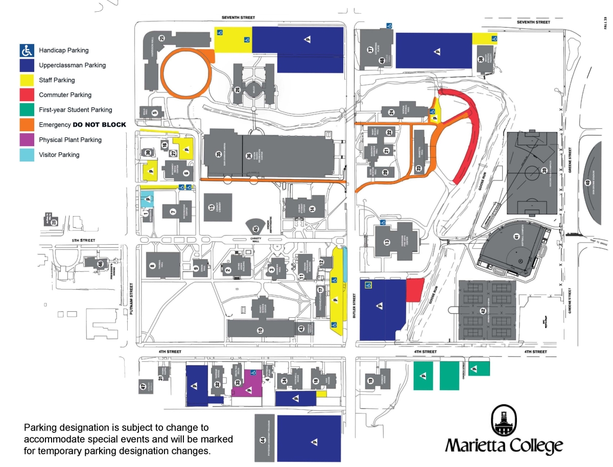 - All parking lots are the property of Marietta College and are designated as faculty/staff lots or student lots. Vehicles parked in all Marietta College parking lots must display a valid parking permit.